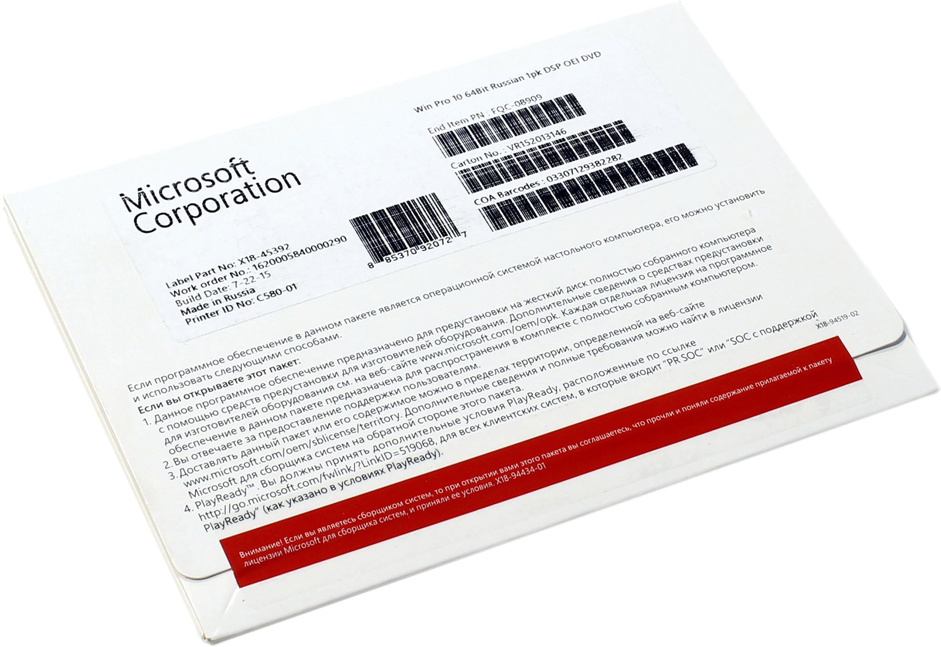 Microsoft Windows 10 Professional GGK 64Bit Russian 1pk DSP ORT OEI DVD